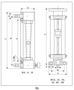 LZB/LZB-( )F流量计的锥管为光滑内壁管(见图4),通径DN15以上的流量计,浮子通过导杆 上下移动,保持稳定;LZJ/LZJ-( )F流量计锥管 内壁有三条导向凸筋,使浮子保持稳定(见图4)。 通径DN10以下的流量计采用软管连接,配有 针形流量调节阀;通径DN15以上流量计采用 法兰连接。