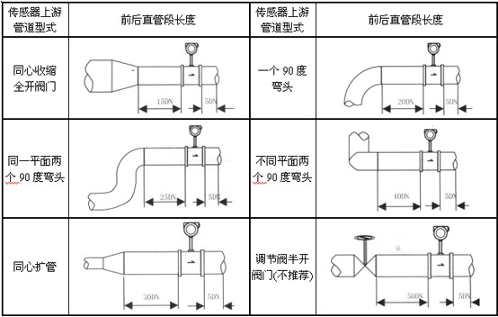 3、涡街流量计的上游侧和下游侧应留有较长的直管段,要求的上下游直管段长度随管道状况不同而异。涡街流量计的上游应尽量避免安装调节阀或半开阀门,应将调节阀或半开阀门安装在流量计下游5D以后。