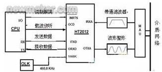 HT2012 芯片用来实现HART 协议中通讯信号的解调及调制过程。图2为调制解调器与微处理器的连接。