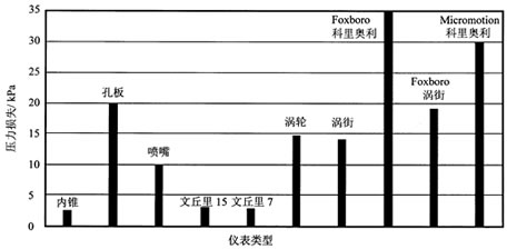 表2中,n的平均值约为1.7。R.W.Miller(1989)曾经给出了几种流量计的压力损失6,如图5所示的流速为4.2m/s时,不同流量计的压力损失情况。其中孔板流量计的β=0.75;涡街流量计为Foxboro公司生产的,口径为80mm;流体介质为水,水的压力为6bar。